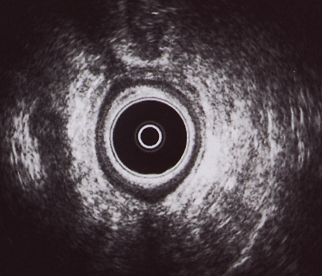CANAL ANAL ALTO: Imagen hipoecogénica por encima de la rama derecha del puborrectal y posterior, compatible con absceso postanal y supraelevador derecho