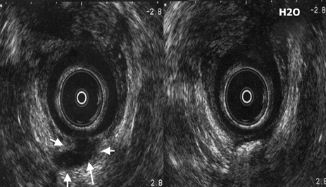 Imágenes de un mismo paciente correspondientes a fístula supraesfinteriana. Izquierda: zona hipoecogénica posterior a nivel del puborrectal correspondiente al trayecto de la fístula (flechas). Derecha: con H2O2 se confirma que se rellena el trayecto con agua oxigenada y se hace hiperecogénico y deja sombra posterior. |